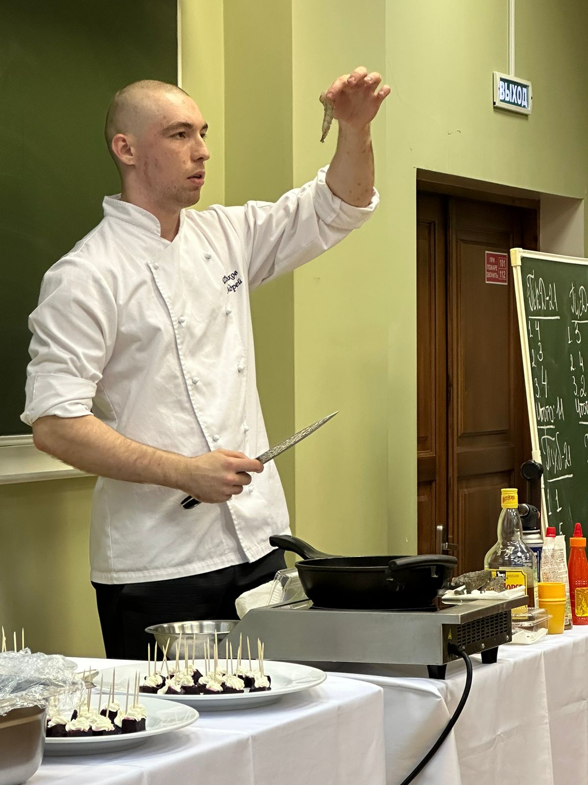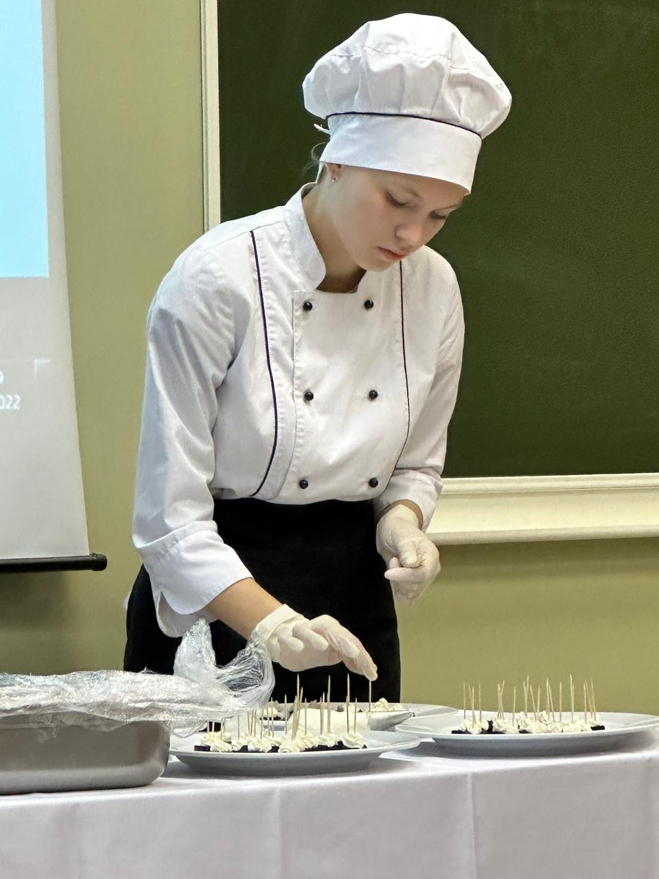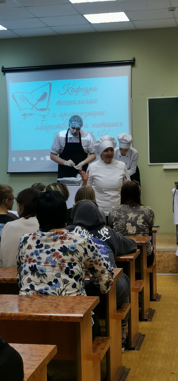 Насыщенная программа началась с небольшого экскурса в виде презентации о кафедре и проводимых ею мероприятиях, студенческой жизни и важных профессиональных событиях в период обучения. Было отмечено, что хорошие повара очень ценятся и могут сделать блестящую карьеру, но для стремительного взлета к вершинам успеха нужно хорошо учиться и много знать и уметь. Мода и тенденции в сфере кулинарии постоянно меняются, так что высококлассному повару необходимо всегда быть в курсе актуальных кулинарных тенденций и современных технологий.